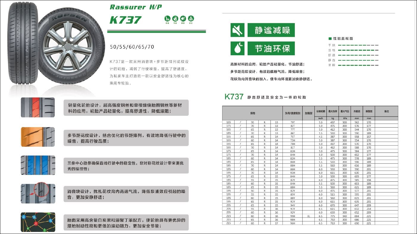 K737是一款採用消音塊+多節距排列花紋設計的輪胎,減弱了行駛噪音,提高了舒適度,為私家車主打造的一款以安全舒適性為核心的乘用車輪胎。