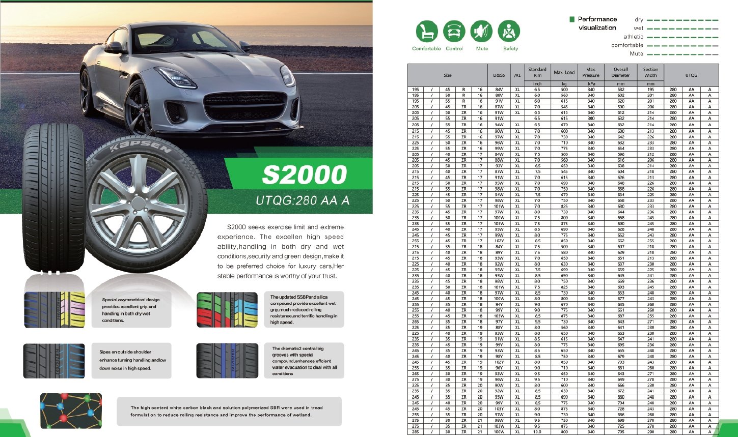 S2000是卓越的高速性能、乾濕路面操控性、安全性和環保設計,使其成為豪華車的理想選擇。其穩定的性能值得您的信賴。特殊的不對稱設計在乾燥和潮濕的條件下都能提供出色的抓握力和操控性。升級後的 SSBP 和二氧化矽化合物提供了優異的濕地抓地力、大幅降低的滾動阻力以及高速行駛時的出色操控性。