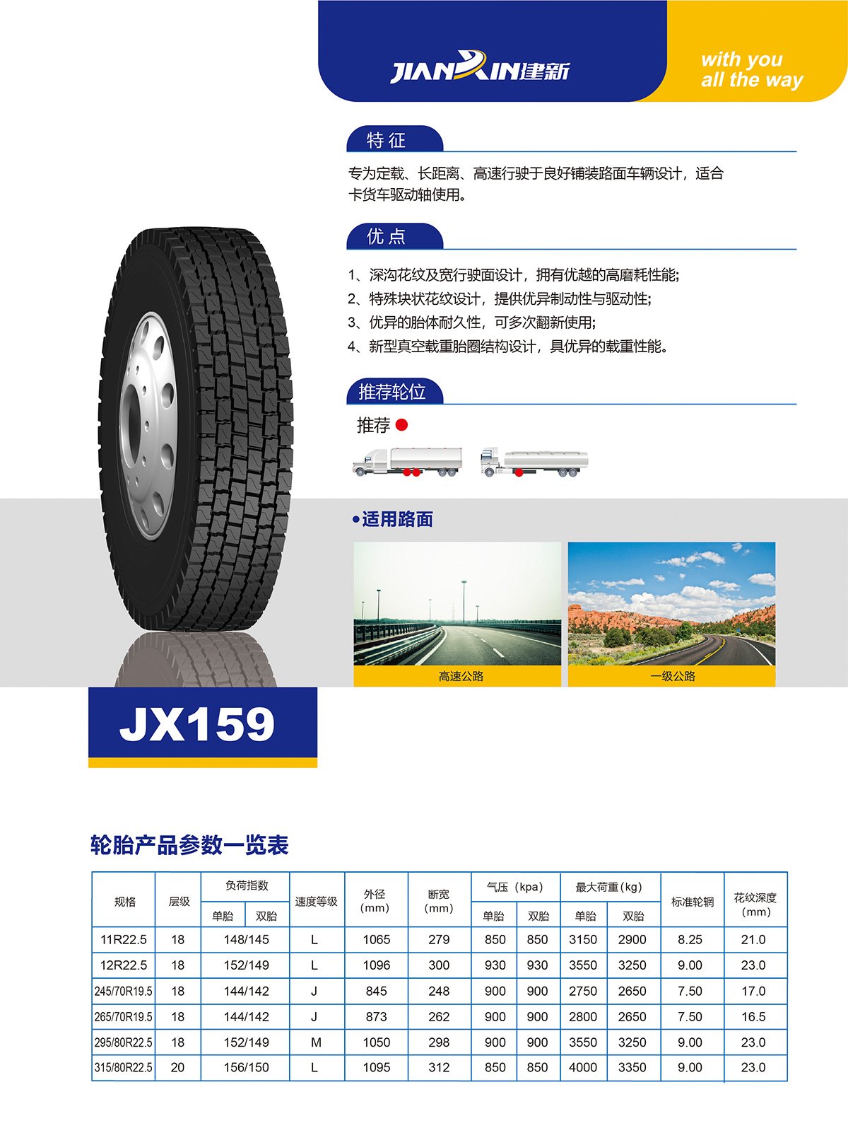 1.深溝花紋及寬行駛面設計,擁有優越的高磨損性能。