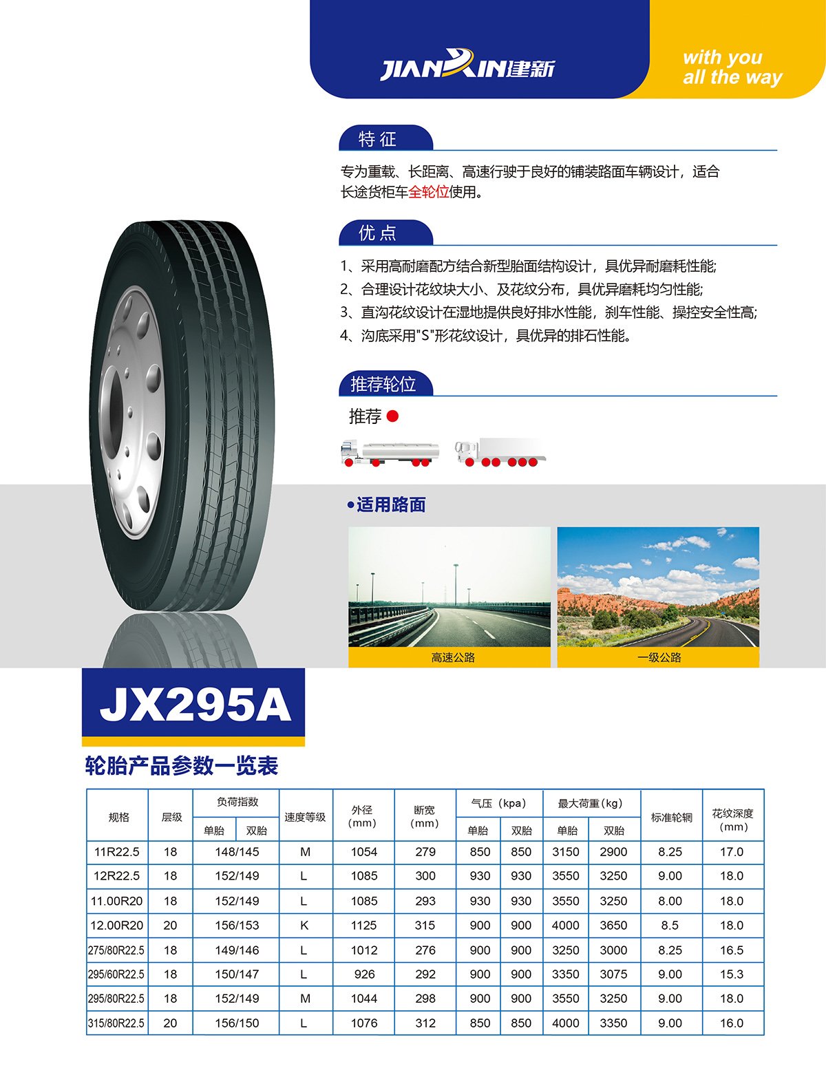 專為重載、長距離、高速行駛於良好的鋪裝路面車輛設計,適合長途貨櫃車全輪位使用。