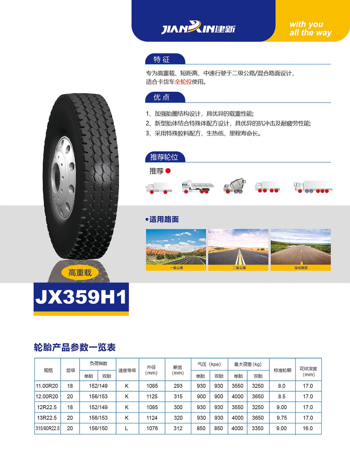 專為高重載、短距離、中速行駛於二級公路/混合路面設計, 適合卡貨車全輪位使用。